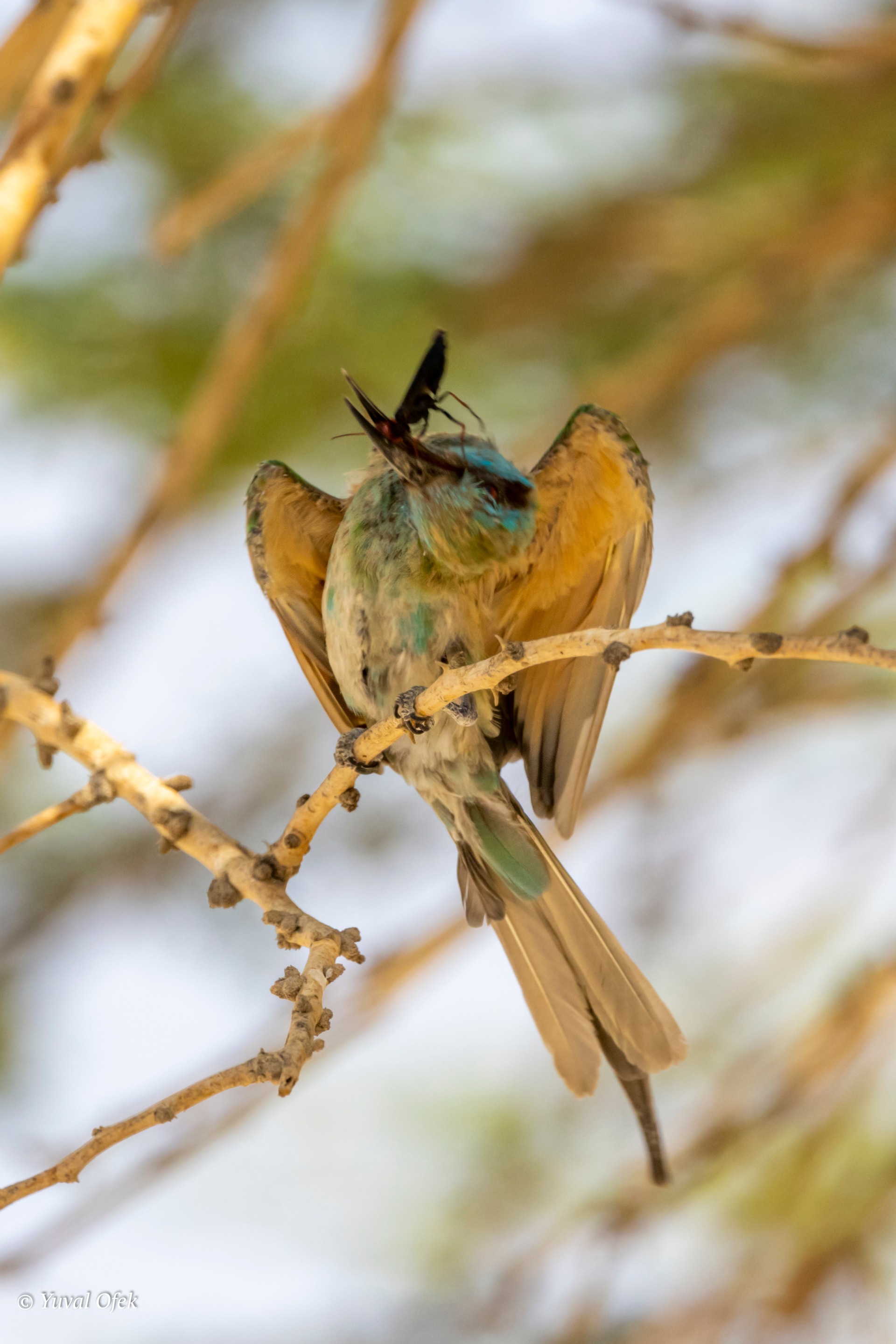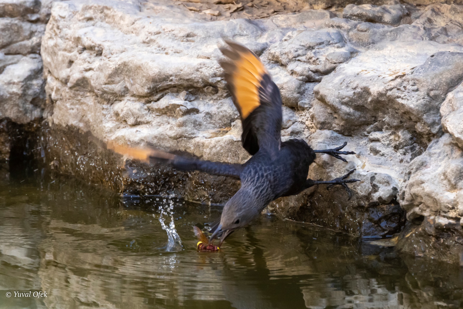 Tristram's Starling acrobatic reach catching a hornet