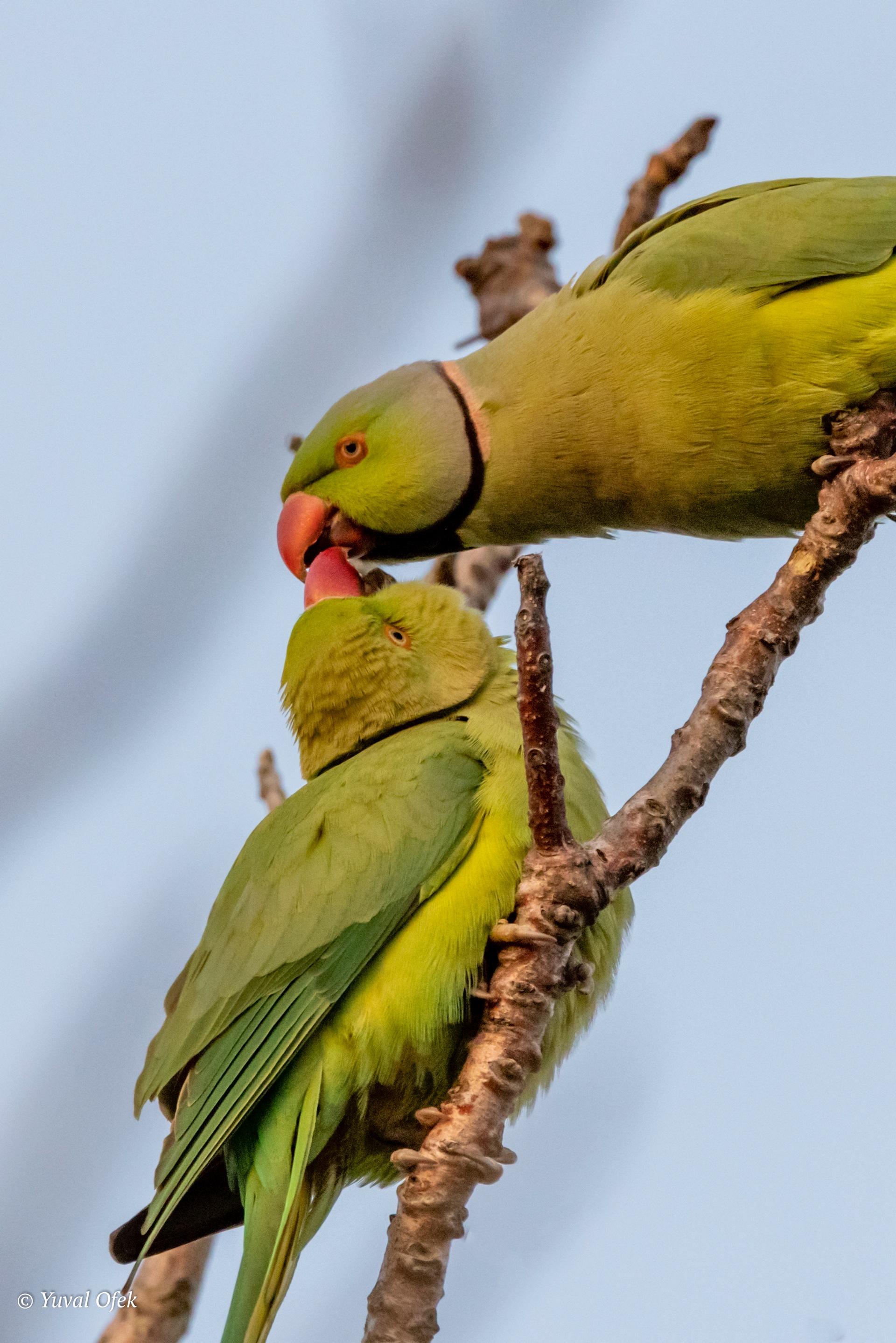 Rose-ringed Parakeet mom feeding its chick
