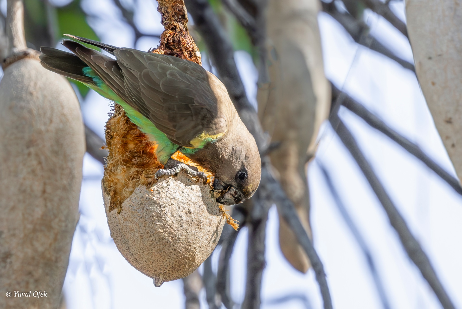 Brown Sicklebill swallowing a piece of papaya