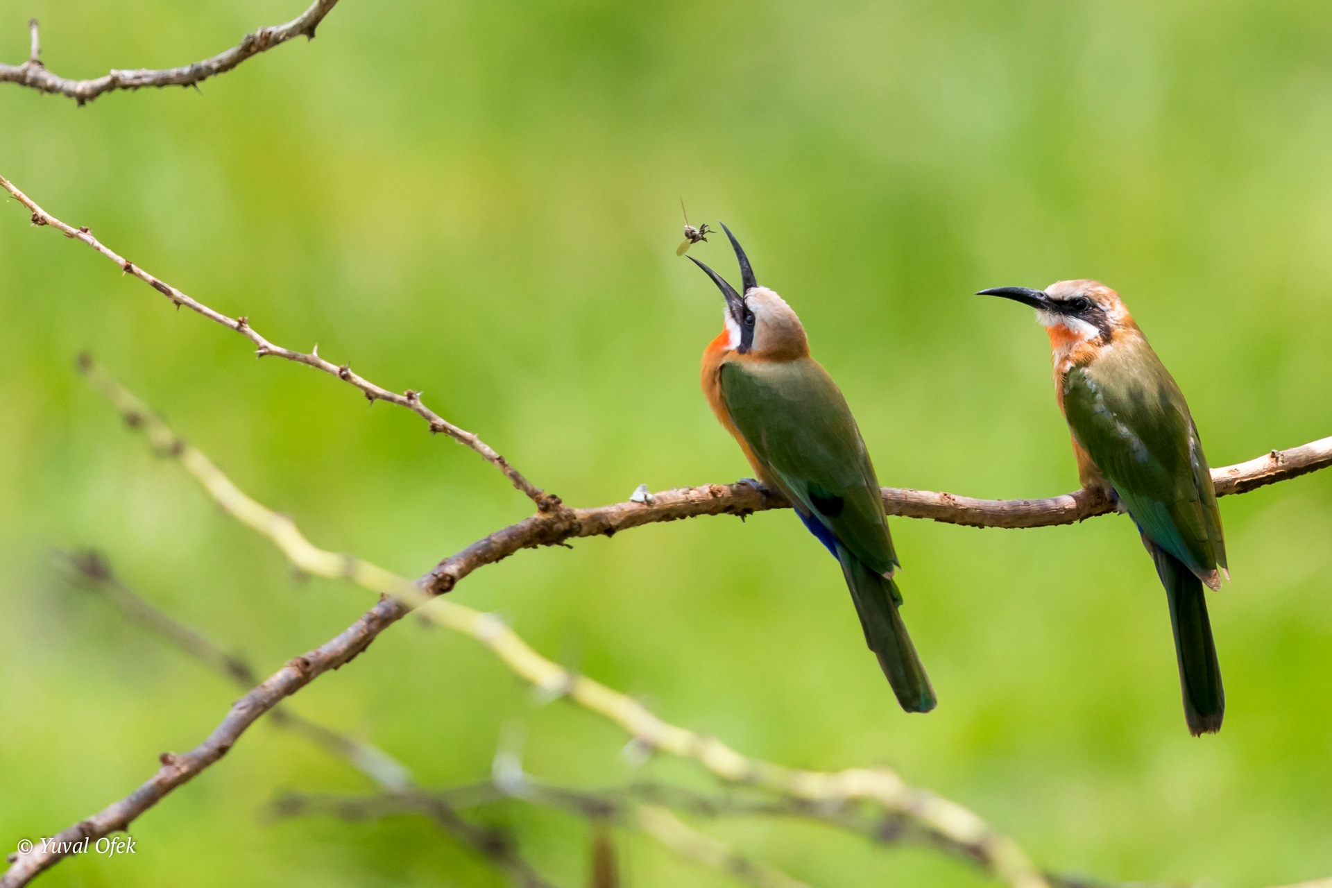 A White-fronted Bee-eater mother demonstrates how to swallow a bee to its chick