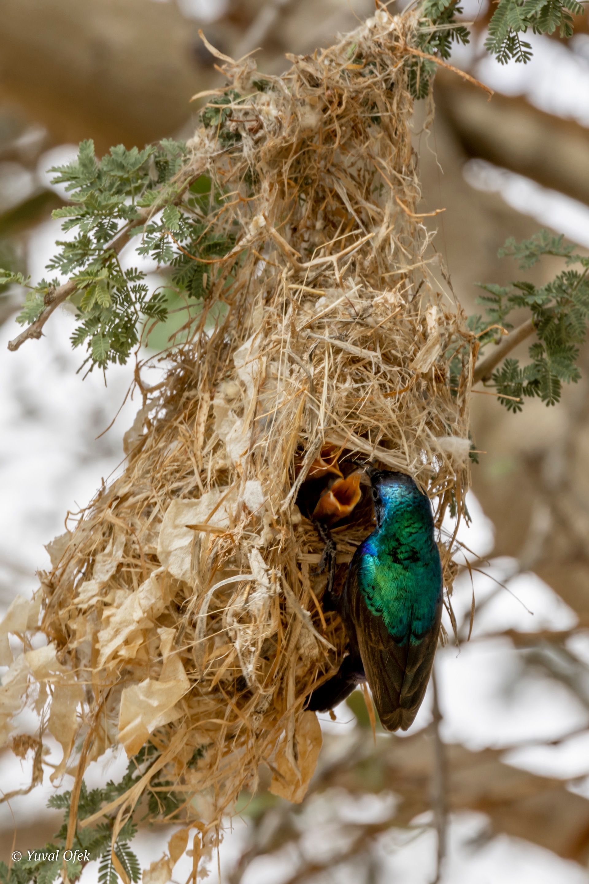 Palestine Sunbird male feeding its two chicks