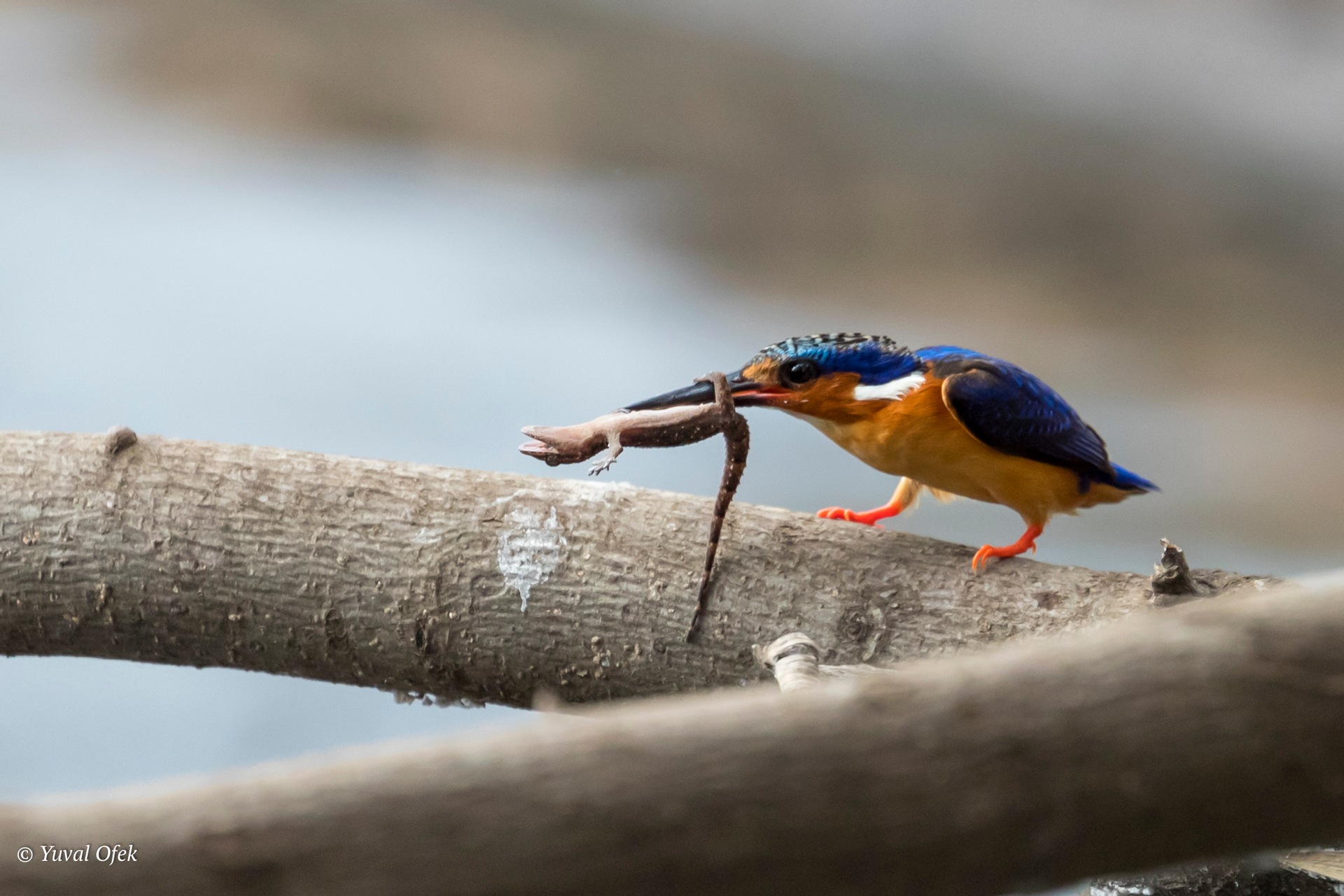 "way over my league..." Madagascar Malachite Kinkfisher trying to eat a huge Gecko