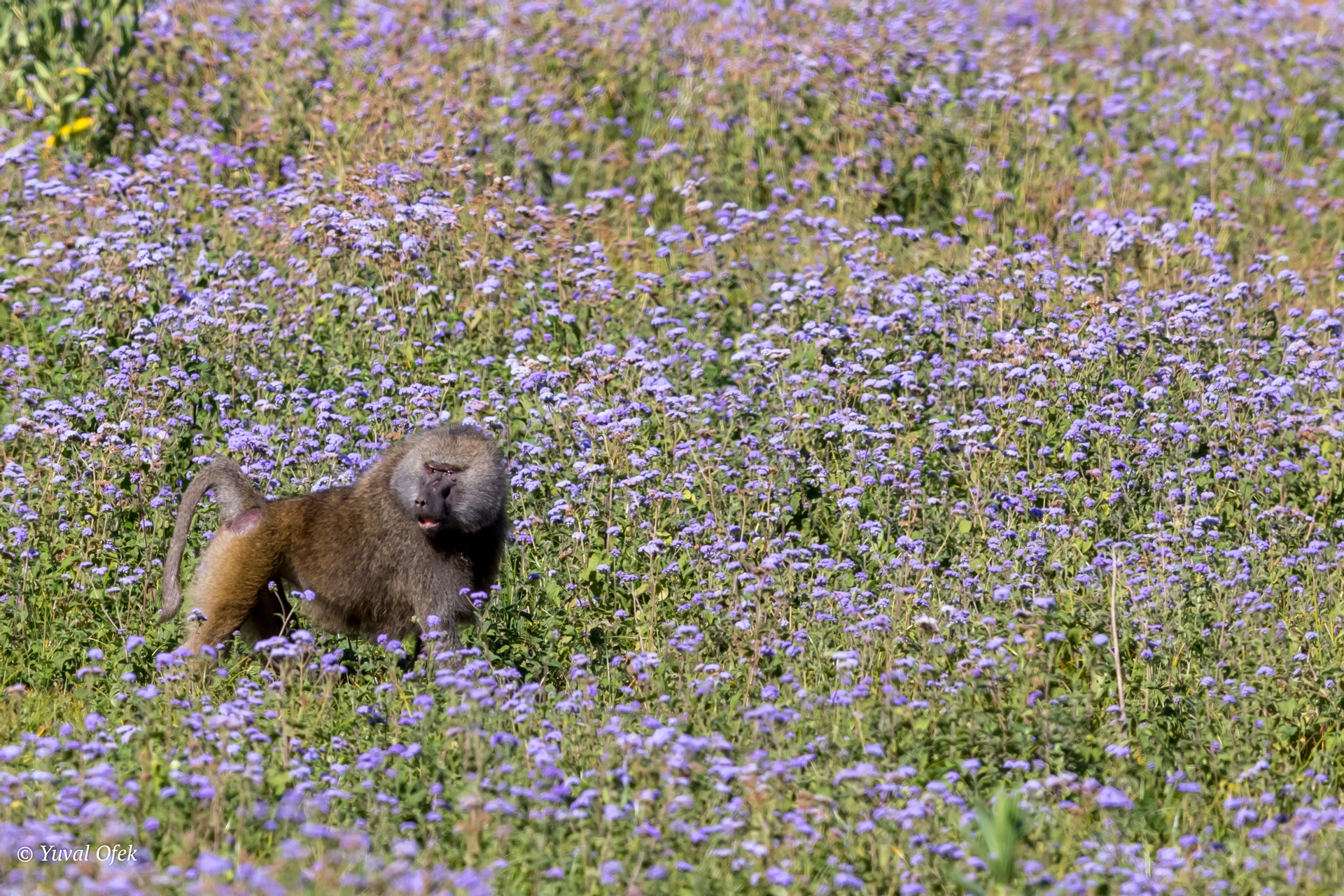 A male Olive Baboon explores the natural flowers field in Arusha national park