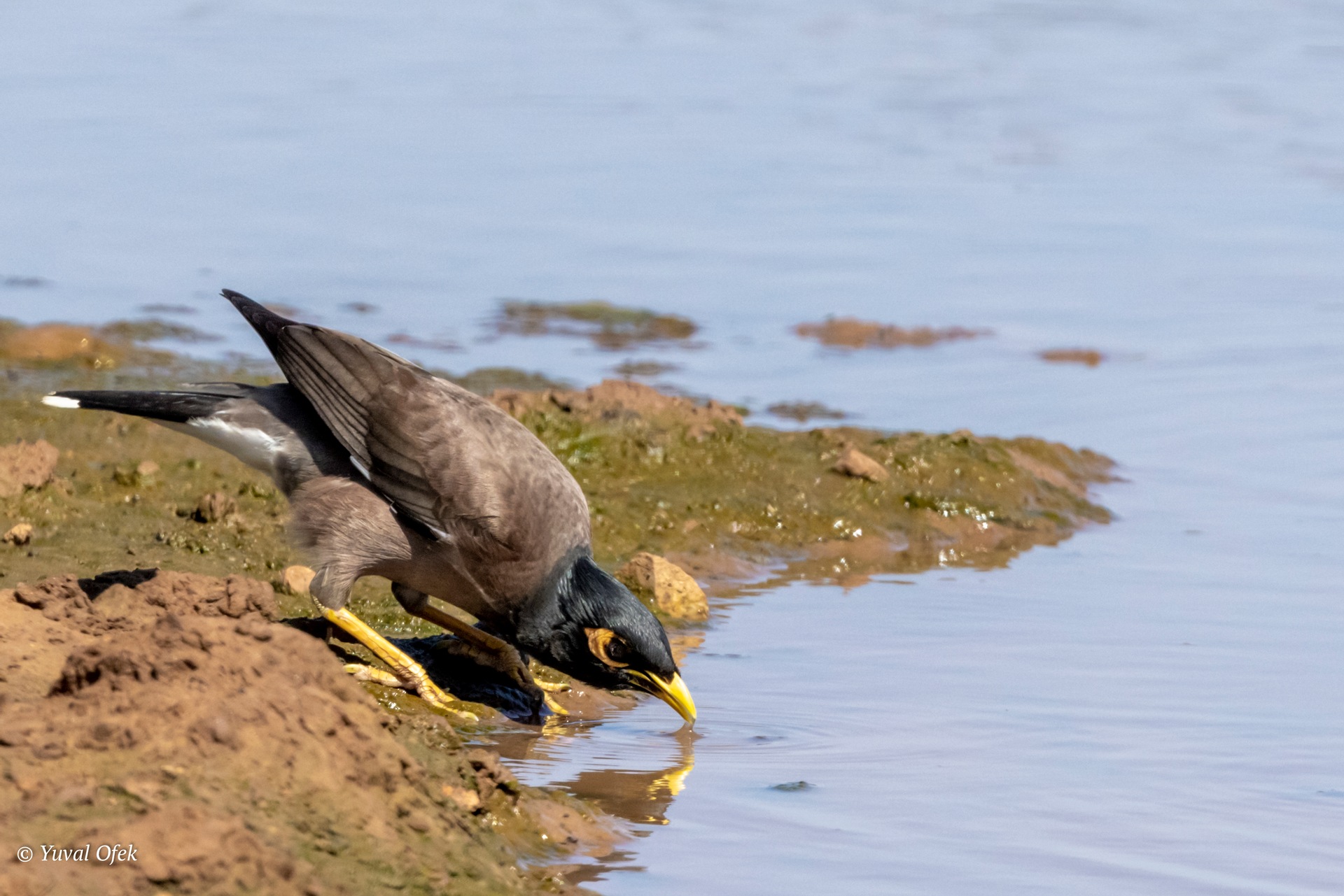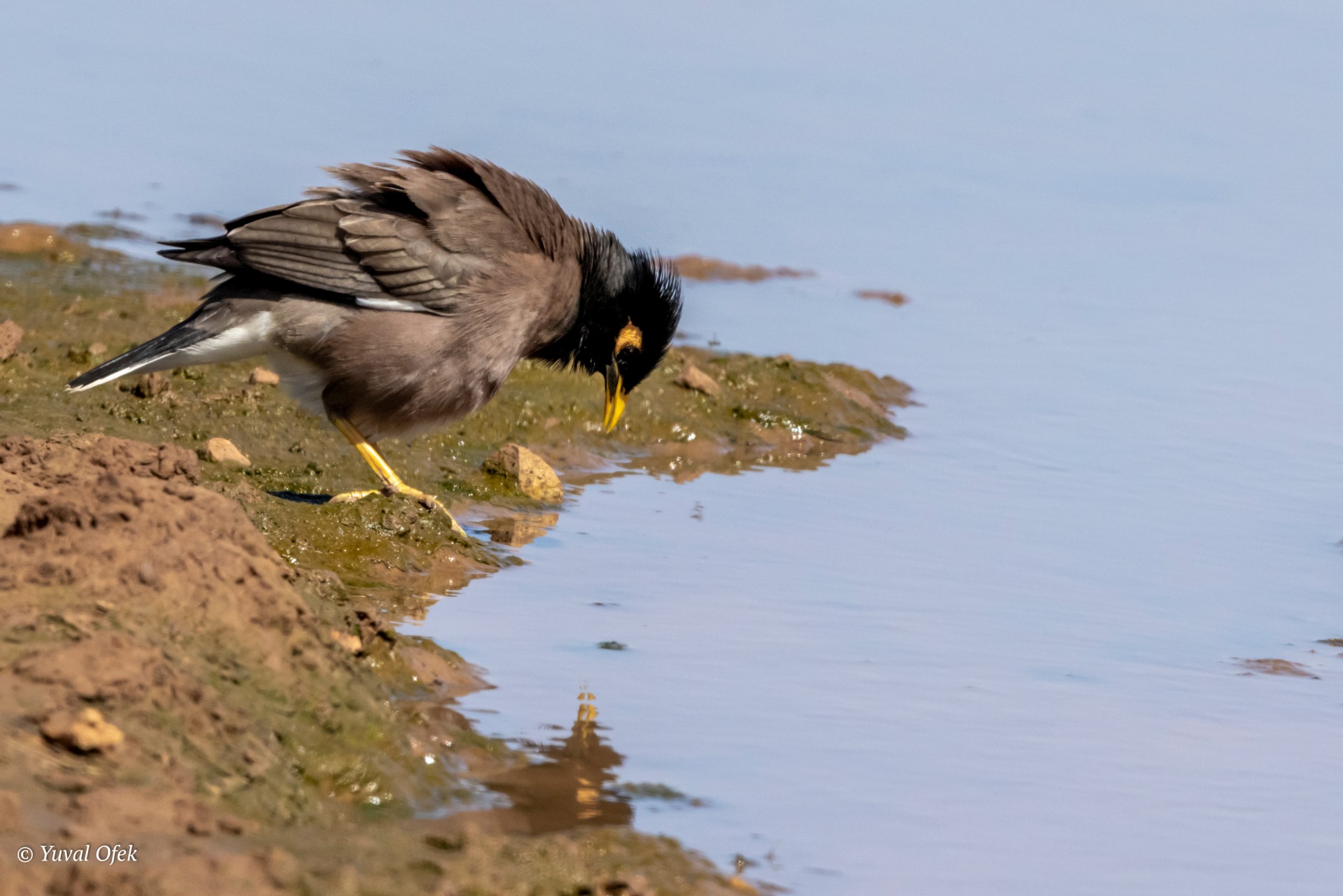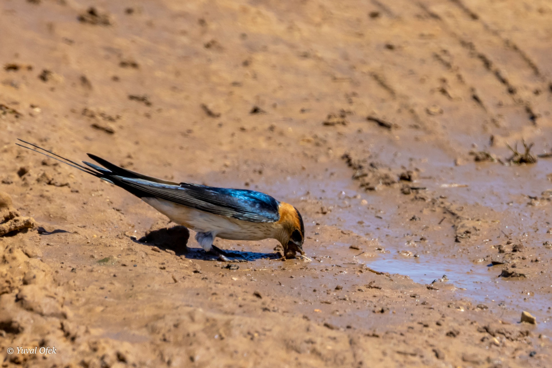 Lands in the mud of the puddle and immediately finds some delicious insect to eat