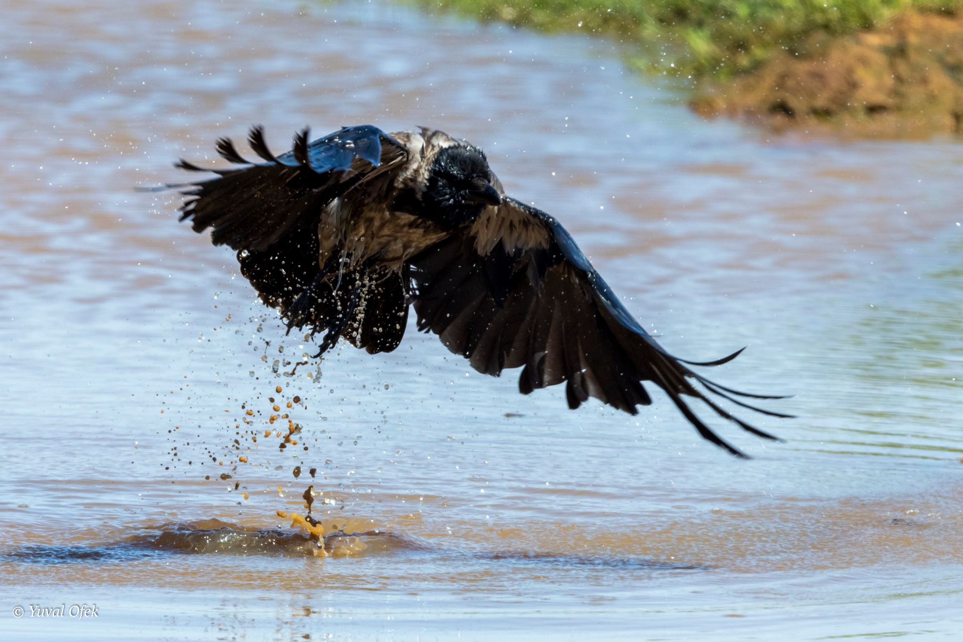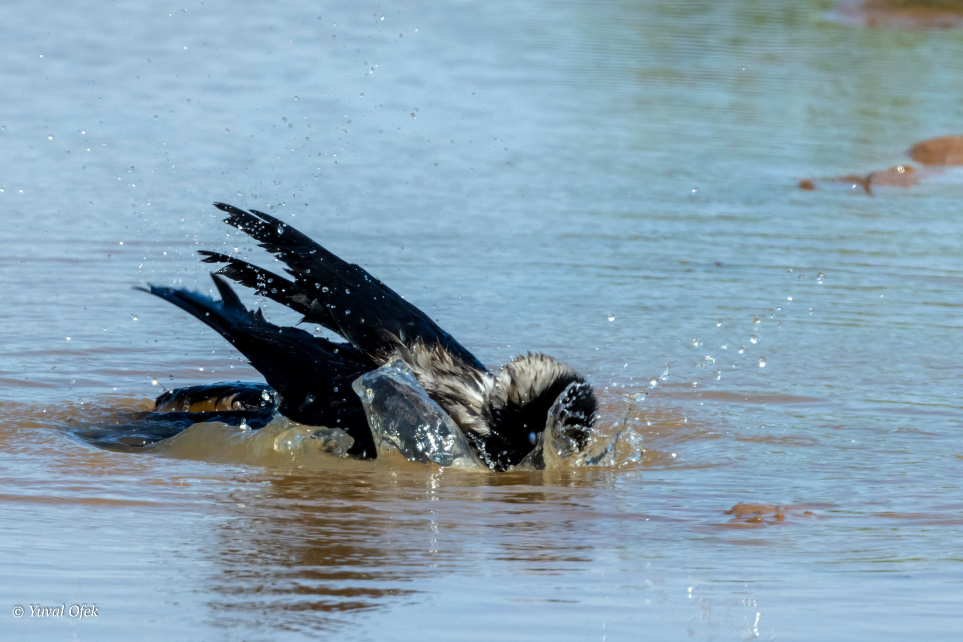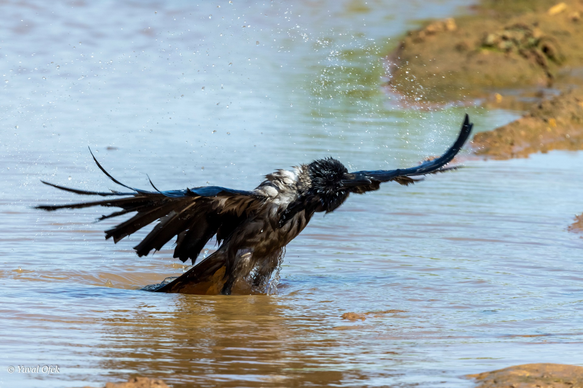 Suddenly a large crow arrives, straight to a fresh shower