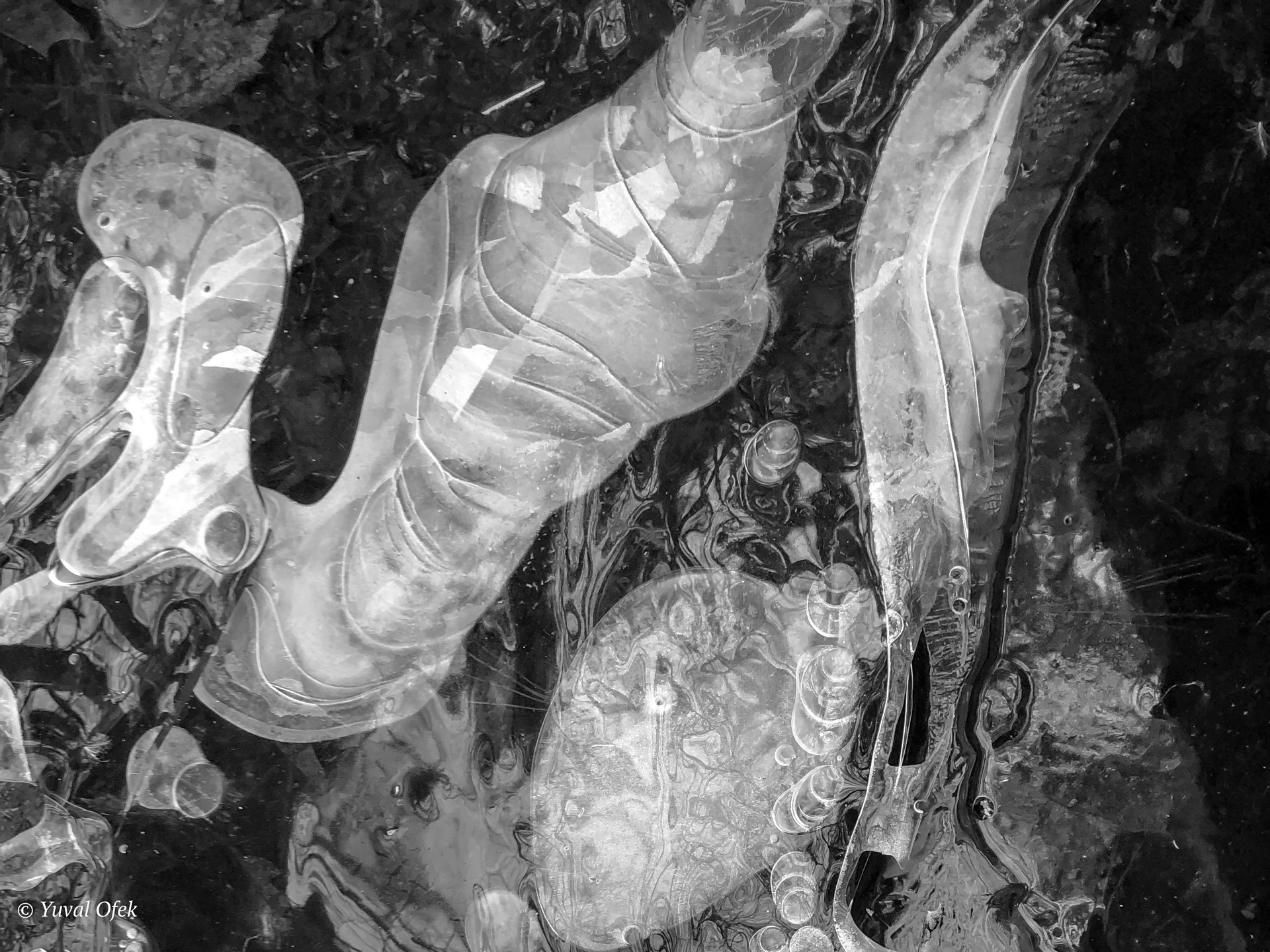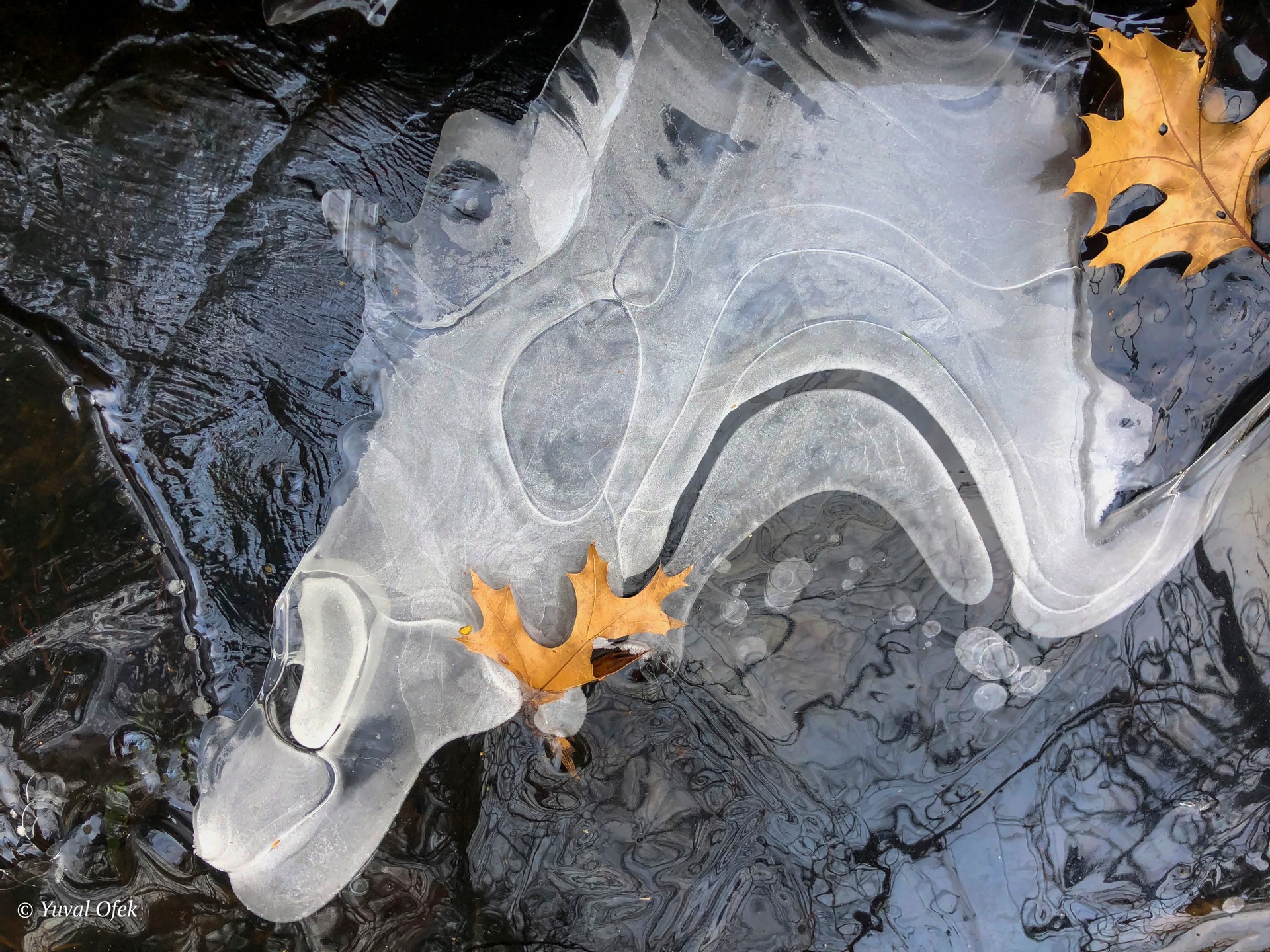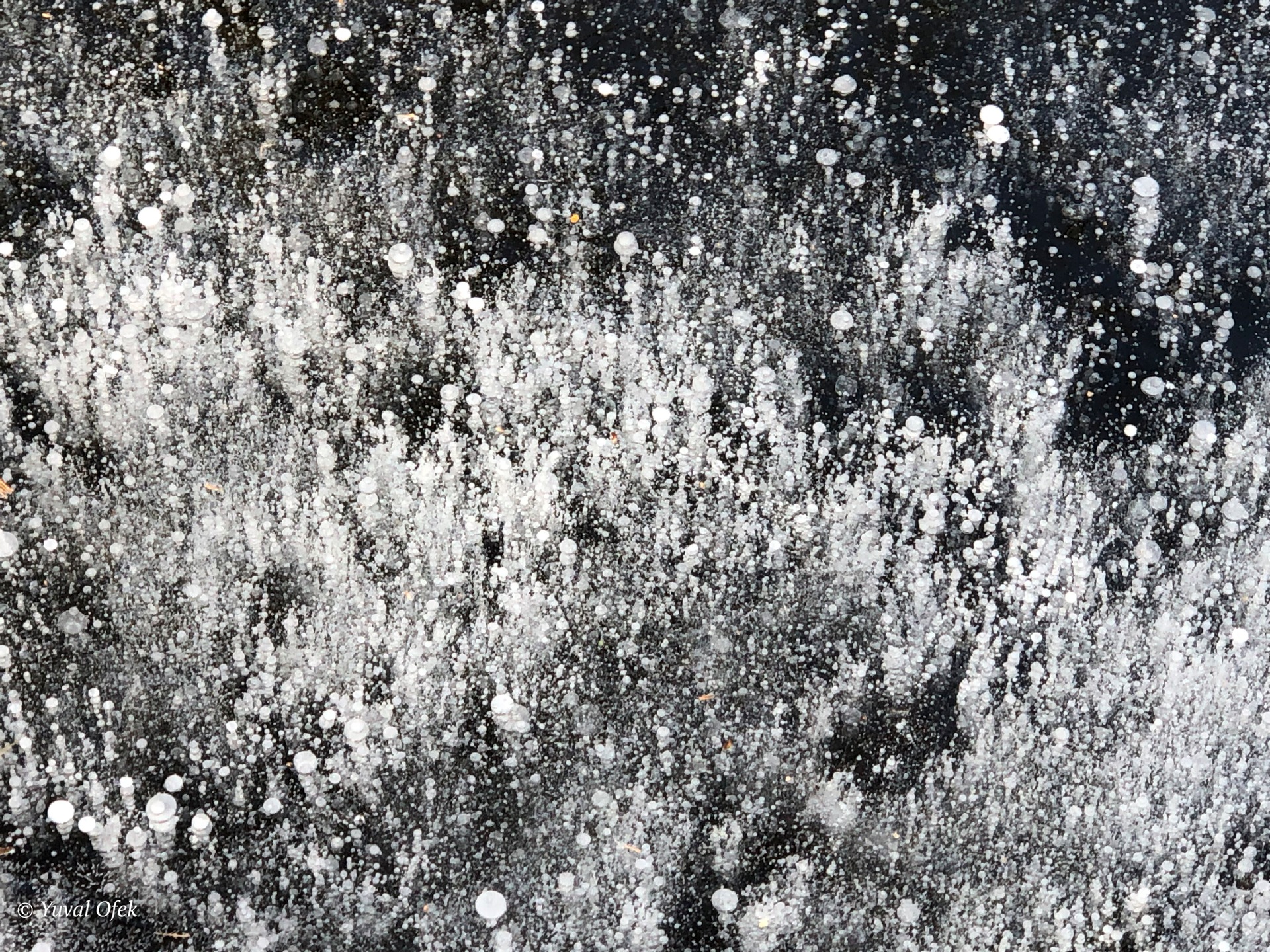 Air bubbles trapped in a frozen river